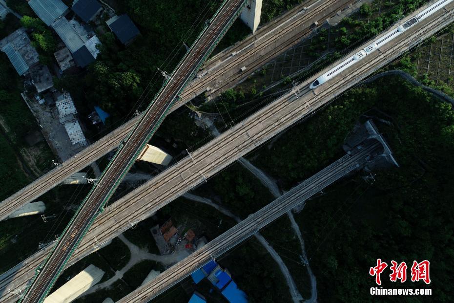 5月16日,航拍貴陽(yáng)市郊交織的五條高鐵線路,一列動(dòng)車駛出隧道。貴州省地處中國(guó)西南腹地,高原山地居多,因此高鐵建設(shè)的橋隧占比較高。在貴陽(yáng)市烏當(dāng)區(qū)新添寨,高鐵滬昆線、貴廣客運(yùn)專線、貴開(kāi)城際客運(yùn)專線的隧道和橋梁交織在一起,形成“五洞五橋”并行。中新社記者賀俊怡 攝