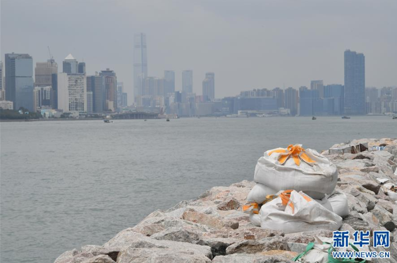 9月14日,工作人員在香港三家村放置沙包防止洪水。新華社記者呂小煒攝