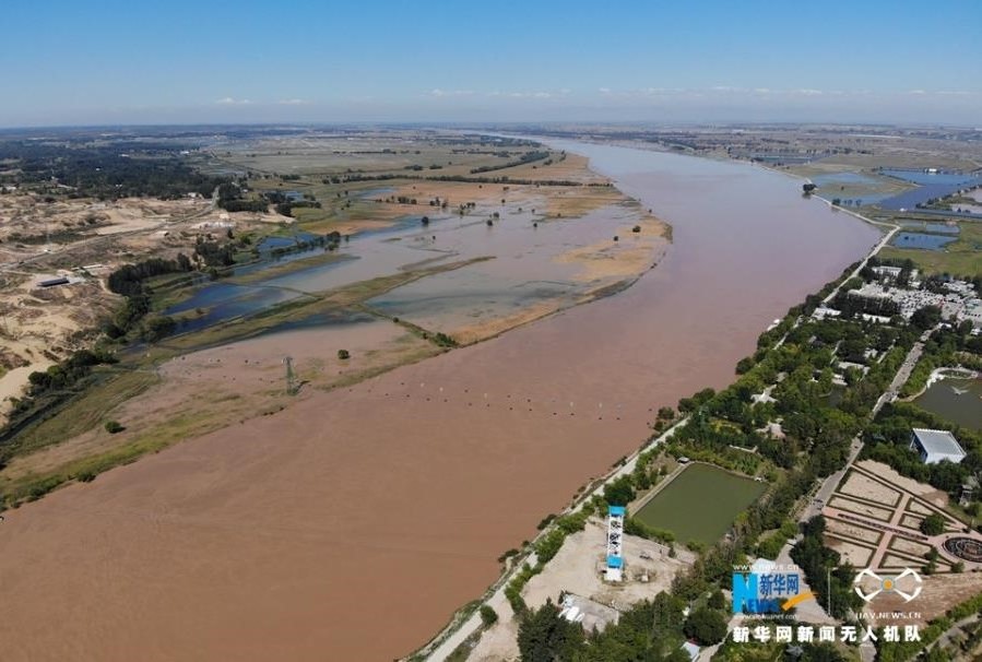 航拍黃河托克托段。黃河兩岸架起了跨黃河旅游觀光纜車。新華網(wǎng) 張偉 攝