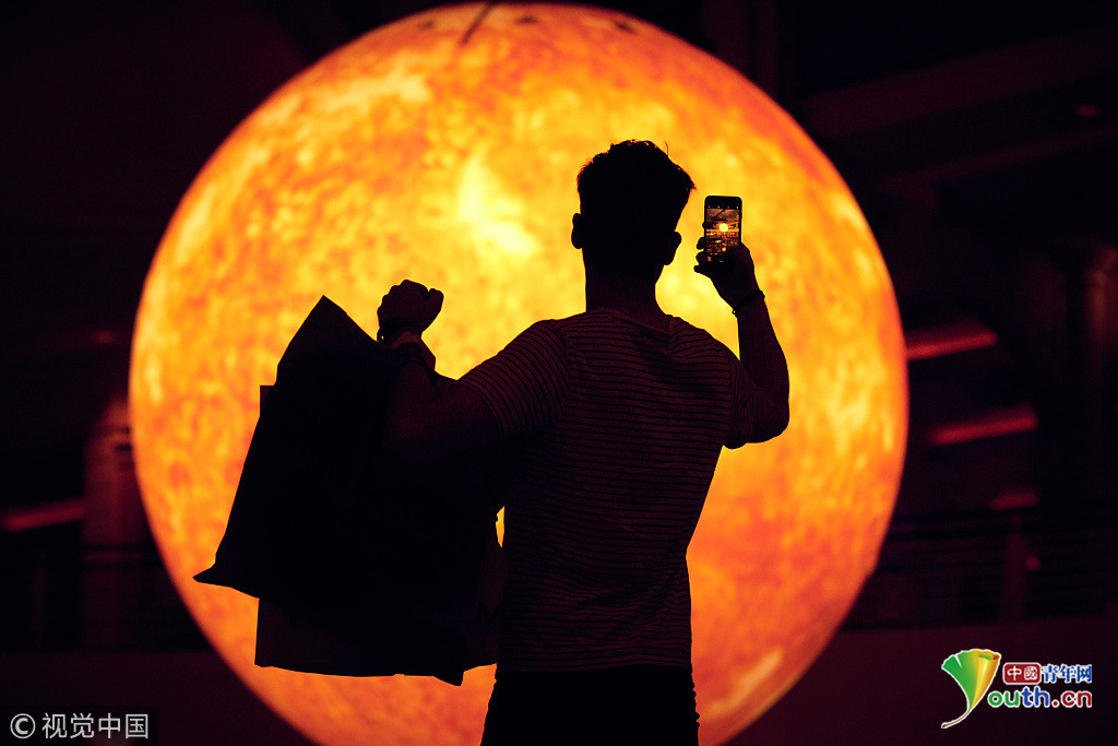 當(dāng)?shù)貢r(shí)間2018年9月18日,英國(guó)曼切斯特,顧客們?cè)谔乩5沦?gòu)物中心的一個(gè)巨型的“太陽”下享受室內(nèi)日光浴,感受英國(guó)未完的史上最熱夏天。這個(gè)人造“太陽”的亮度相當(dāng)于1.2萬個(gè)燈泡。圖片來源:視覺中國(guó)