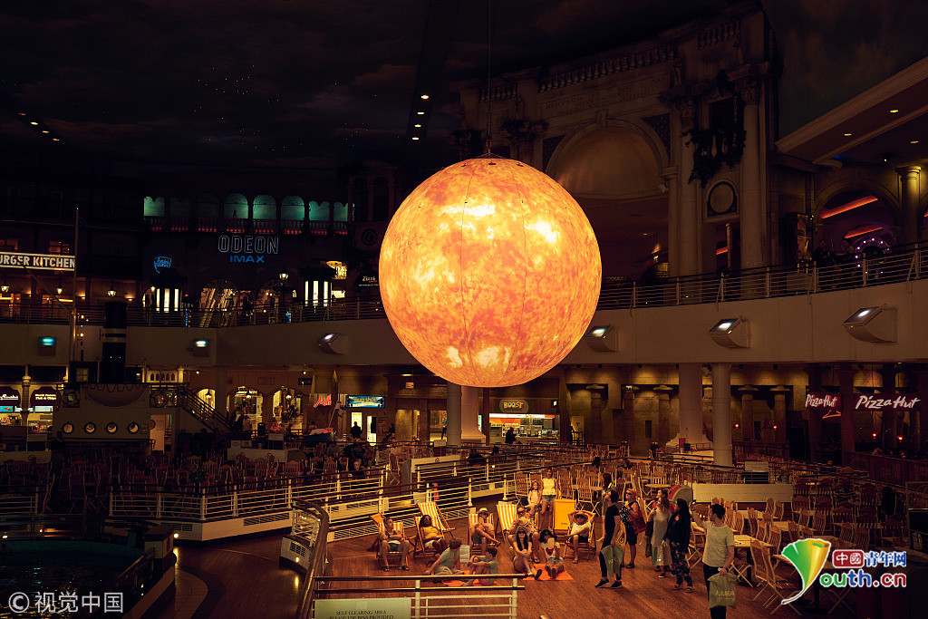 當(dāng)?shù)貢r間2018年9月18日,英國曼切斯特,顧客們在特拉福德購物中心的一個巨型的“太陽”下享受室內(nèi)日光浴,感受英國未完的史上最熱夏天。這個人造“太陽”的亮度相當(dāng)于1.2萬個燈泡。圖片來源:視覺中國