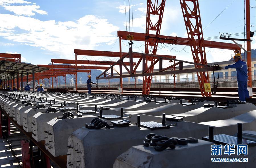 9月19日,在位于西藏拉薩曲水縣的中鐵十一局三公司協(xié)榮鋪架基地,用于架設(shè)川藏鐵路拉薩至林芝段(拉林鐵路)的首批軌排完成生產(chǎn)下線。據(jù)悉,拉林鐵路鋪軌任務(wù)全長(zhǎng)400余公里,需要生產(chǎn)軌枕44萬多根。 新華社記者 覺果 攝