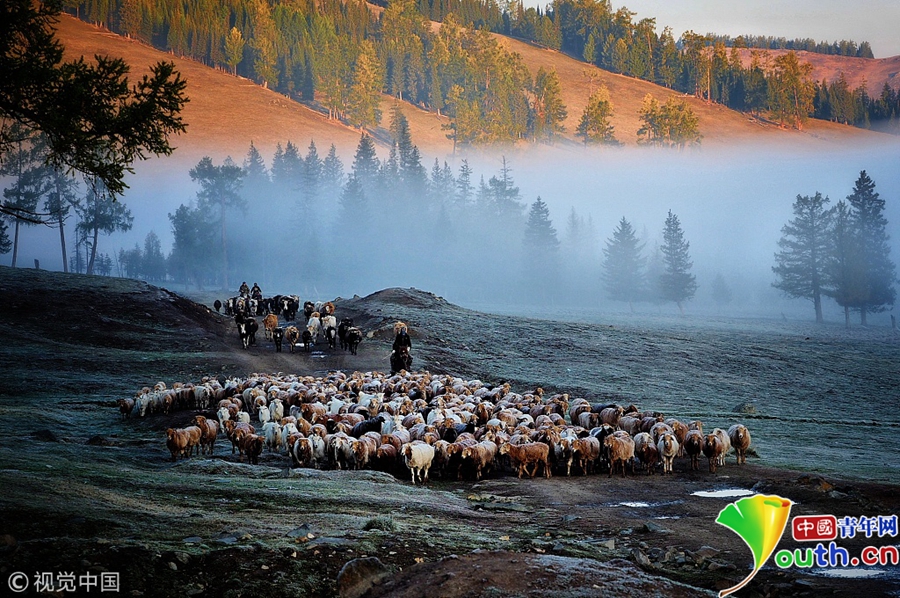 族牧民整理好行裹,抱著孩子,趕著牛羊,浩浩蕩蕩向秋牧場(chǎng)遷徙。
