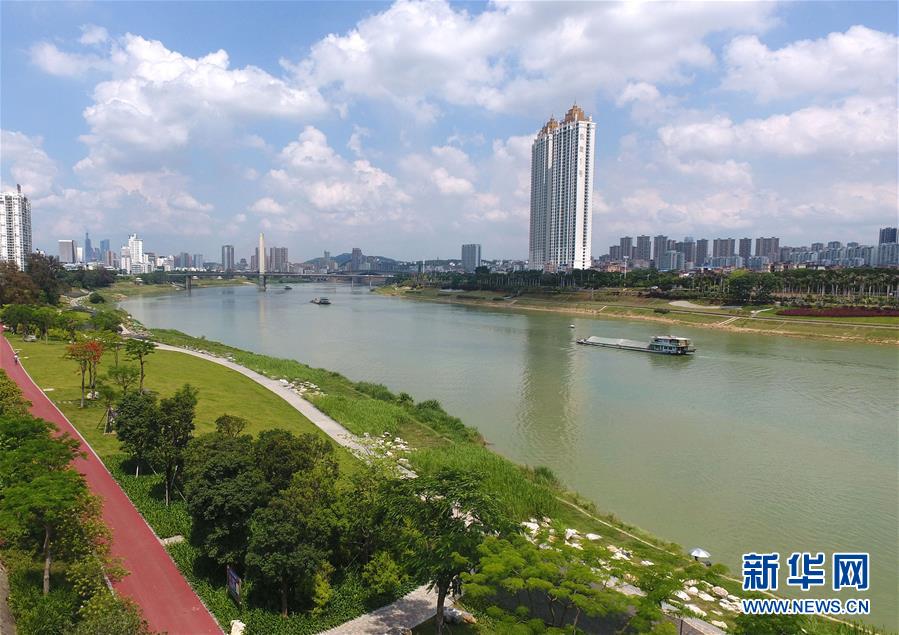 這是船舶在西江黃金水道邕江南寧段航行(5月20日攝,無人機(jī)航拍)。 新華社記者 周華 攝