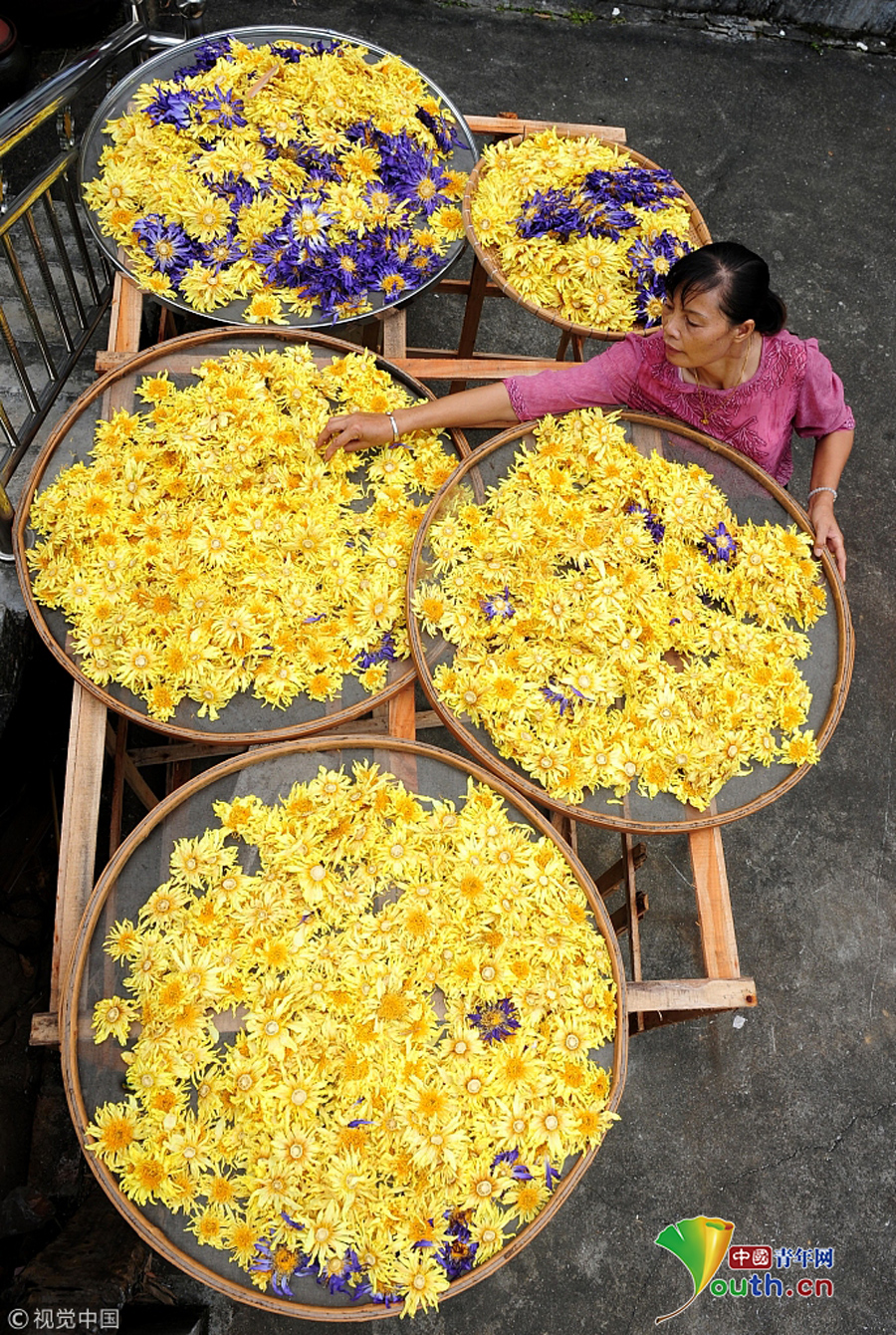 2018年9月23日,廣西柳州,柳北區(qū)石碑坪鎮(zhèn)下陶村的農(nóng)民覃向鮮在晾曬九品香蓮。圖片作者:陳健明