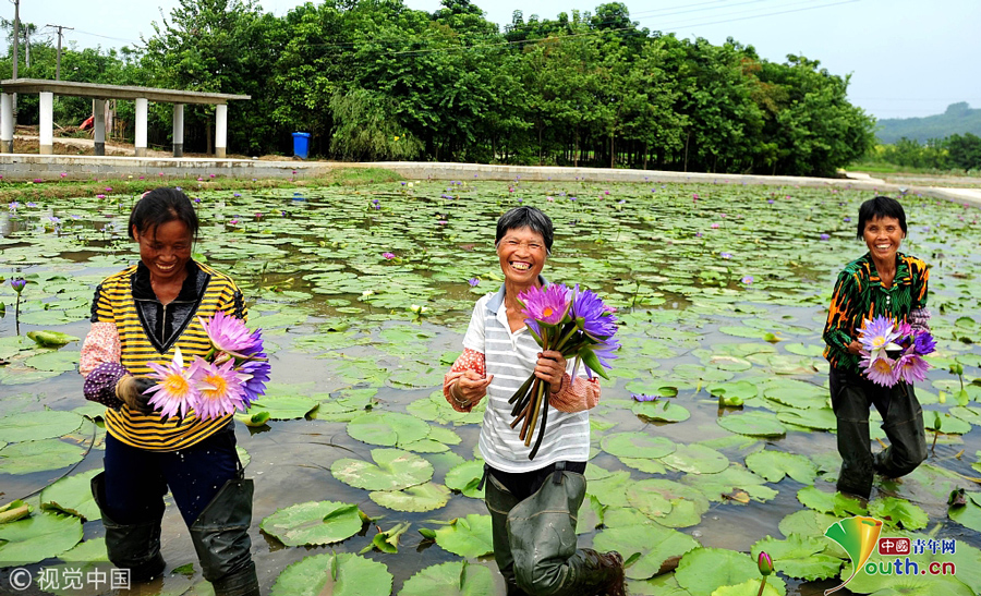 廣西柳州,柳北區(qū)石碑坪鎮(zhèn)下陶村的農(nóng)民在采摘的九品香蓮。圖片作者:陳健明