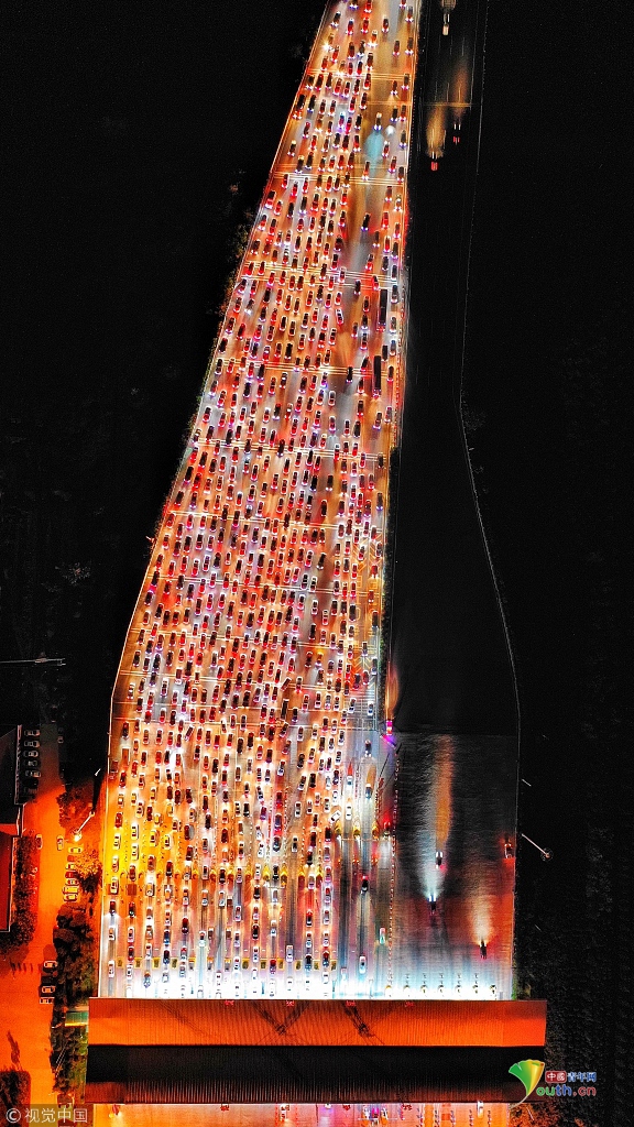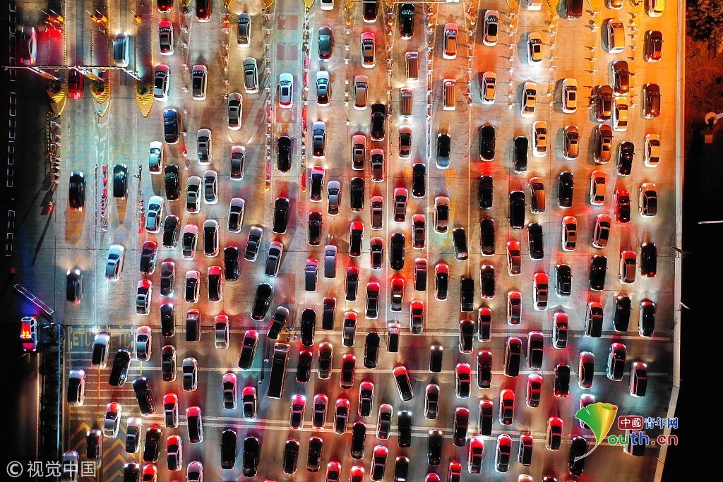 從天上鳥瞰,車輛的尾燈宛若一條紅色的巨龍,望不到盡頭,場(chǎng)面十分壯觀。