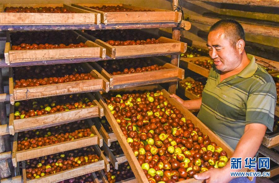 9月22日,河北省棗強縣棗強鎮(zhèn)孟家莊村的棗農(nóng)在展示剛剛收獲的紅棗。 近日,河北省棗強縣的2000多畝棗園迎來收獲季,棗農(nóng)們搶抓農(nóng)時,采摘、篩選、晾曬紅棗,樂享秋收的快樂。 新華社記者李曉果攝