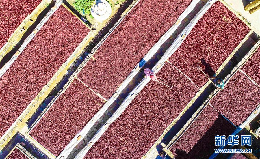 9月22日,河北省棗強縣棗強鎮(zhèn)孟家莊村的棗農(nóng)在晾曬紅棗。 近日,河北省棗強縣的2000多畝棗園迎來收獲季,棗農(nóng)們搶抓農(nóng)時,采摘、篩選、晾曬紅棗,樂享秋收的快樂。 新華社記者李曉果攝