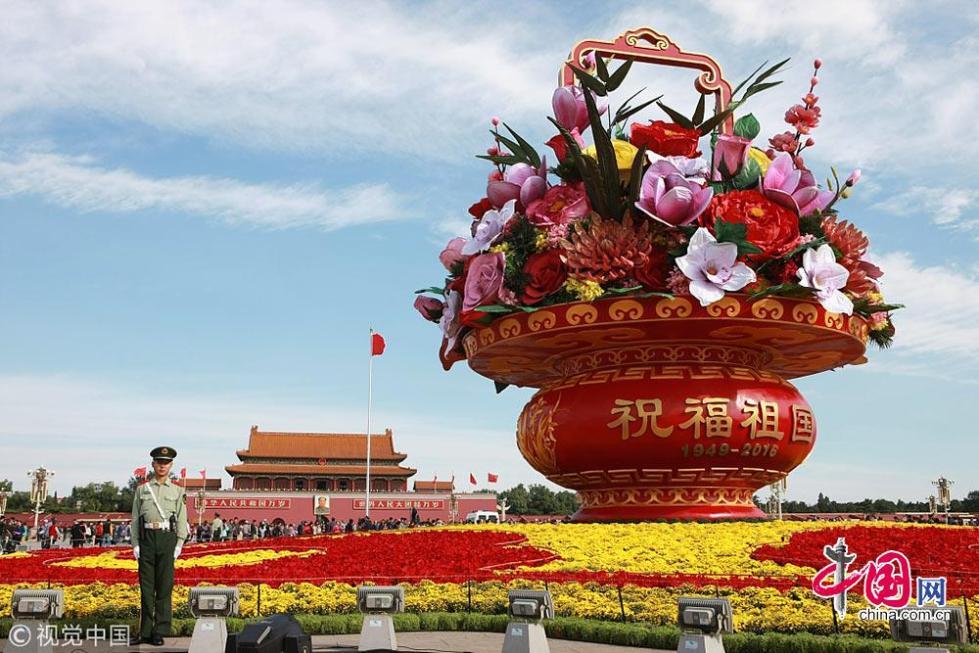 昨天,不少游客在天安門廣場(chǎng)前駐足拍照。經(jīng)過一周多時(shí)間的日夜奮戰(zhàn),“祝福祖國(guó)”巨型花籃組裝完成。北京青年報(bào)從市園林綠化局獲悉,自2011年開始,“祝福祖國(guó)”巨型花籃就一直作為廣場(chǎng)中心花壇,在國(guó)慶節(jié)期間向祖國(guó)獻(xiàn)禮。今年花籃為鋼架結(jié)構(gòu),籃身為玻璃鋼材質(zhì),可抗10級(jí)風(fēng)。籃體南側(cè)書寫“祝福祖國(guó),1949-2018”,籃體北側(cè)書寫“歡度國(guó)慶,1949-2018”。