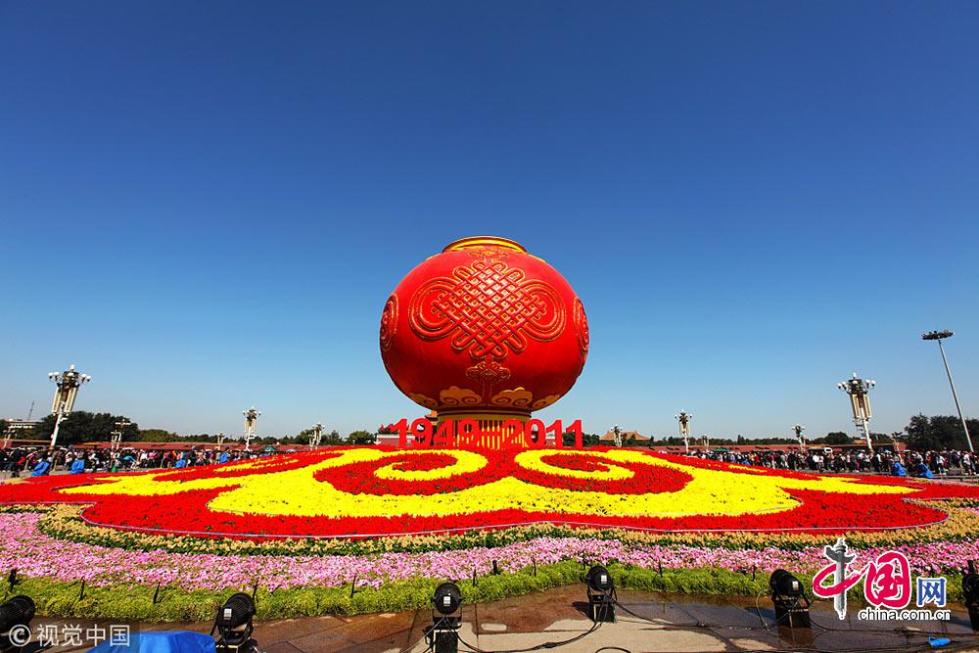 2011年10月04日,在北京蔚藍(lán)的天空下,“祝福祖國(guó)”的大型花壇屹立在天安門廣場(chǎng)中央。蘇陽(yáng)攝影