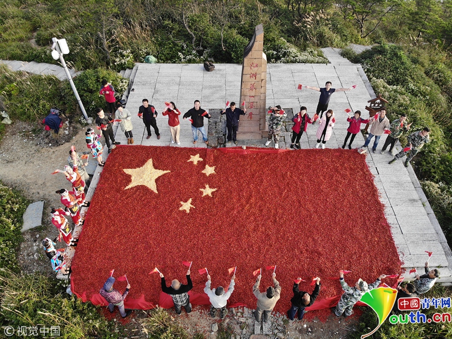 中國青年網(wǎng)北京9月26日電 9月26日,長三角第一高峰浙江龍泉山農(nóng)作物喜獲豐收,當(dāng)?shù)剞r(nóng)民與游客用8噸剛收獲的辣椒以及玉米,在山頂?shù)脑坪V衅闯隽艘幻骈L10米、寬6.6米的巨型國旗慶祝豐收。圖片來源:視覺中國