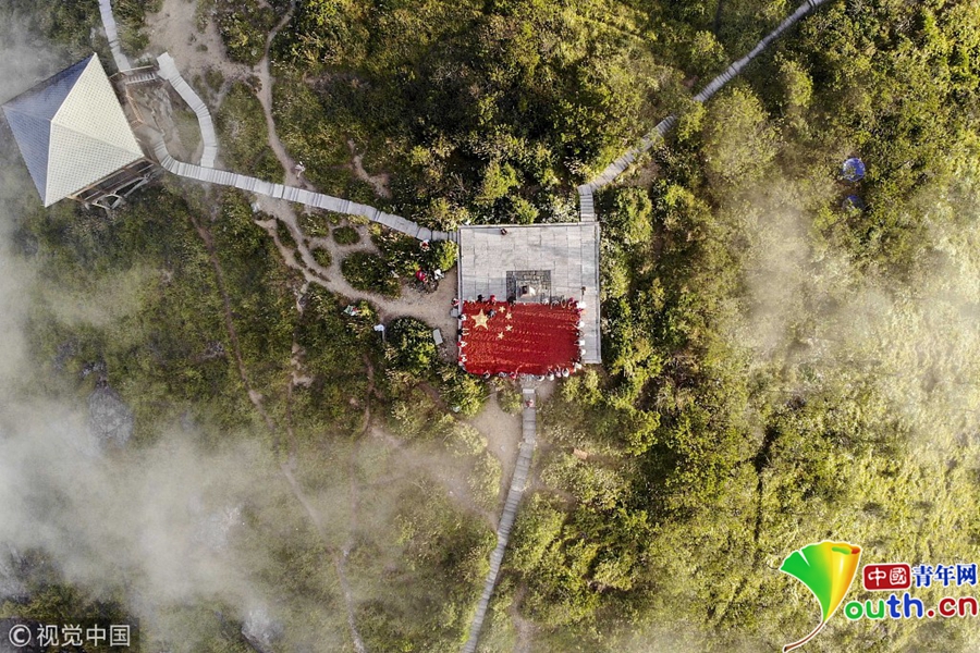中國青年網(wǎng)北京9月26日電 9月26日,長三角第一高峰浙江龍泉山農(nóng)作物喜獲豐收,當(dāng)?shù)剞r(nóng)民與游客用8噸剛收獲的辣椒以及玉米,在山頂?shù)脑坪V衅闯隽艘幻骈L10米、寬6.6米的巨型國旗慶祝豐收。圖片來源:視覺中國