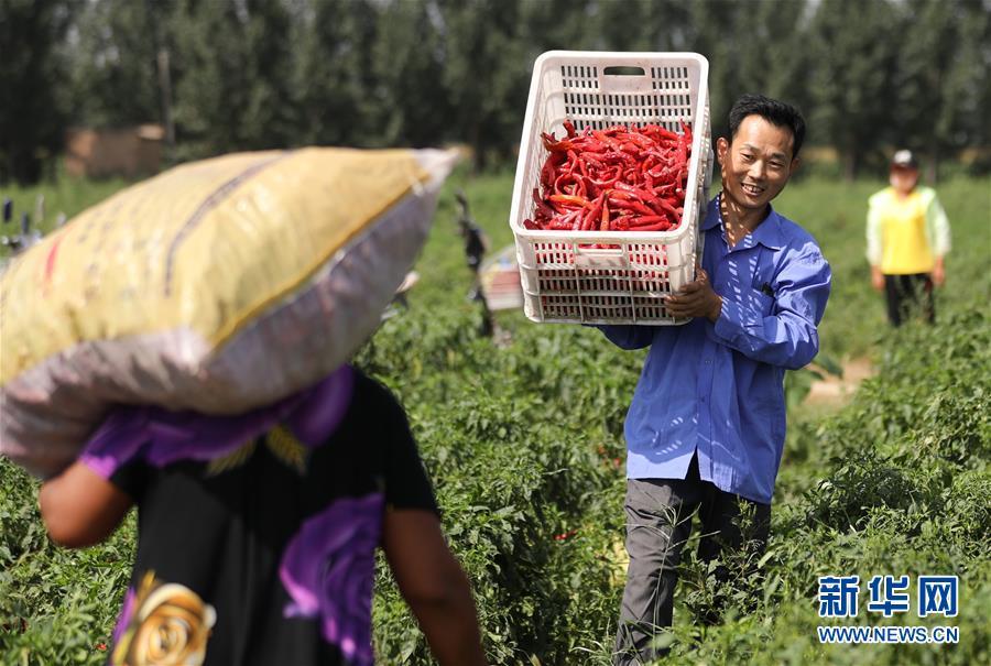 9月16日,阜城縣王集鄉(xiāng)南張莊村農(nóng)民在搬運采摘的辣椒。近年來,河北省阜城縣王集鄉(xiāng)在推進(jìn)產(chǎn)業(yè)富民過程中,積極引導(dǎo)農(nóng)民調(diào)整農(nóng)業(yè)產(chǎn)業(yè)結(jié)構(gòu),按照品種特色化、種植規(guī)模化、產(chǎn)銷一體化的“公司+基地+農(nóng)戶”的經(jīng)營模式,鼓勵農(nóng)民發(fā)展特色辣椒種植,推行“訂單種植”模式,開辟出了一條農(nóng)民創(chuàng)收新路徑。目前,阜城縣王集鄉(xiāng)辣椒種植面積3100余畝,每畝年收益2500元以上,帶動當(dāng)?shù)剞r(nóng)民實現(xiàn)增收。新華社記者朱旭東攝