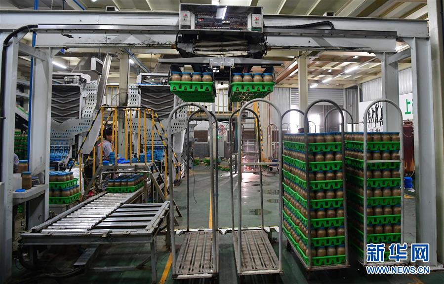 在位于清豐縣的河南龍豐實(shí)業(yè)股份有限公司,“機(jī)械手”在裝瓶車間自動(dòng)轉(zhuǎn)運(yùn)食用菌栽培瓶(9月28日攝)。新華社記者馮大鵬攝