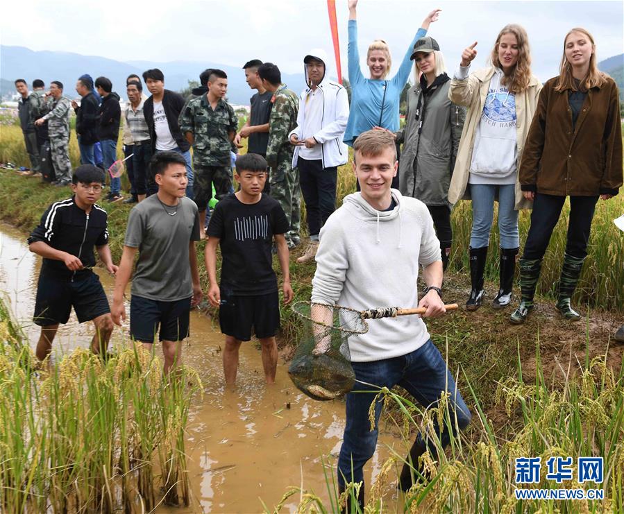 9月29日,外國游客體驗(yàn)摸魚。9月29日,云南省尋甸回族彝族自治縣2018年首屆農(nóng)民豐收節(jié)暨第二屆摸魚節(jié)在雞街鎮(zhèn)舉行,當(dāng)?shù)剞r(nóng)民和游客在豐收的稻田里進(jìn)行摸魚、拔谷穗、山歌對唱等活動(dòng),享受收獲的喜悅。新華社記者楊宗友攝