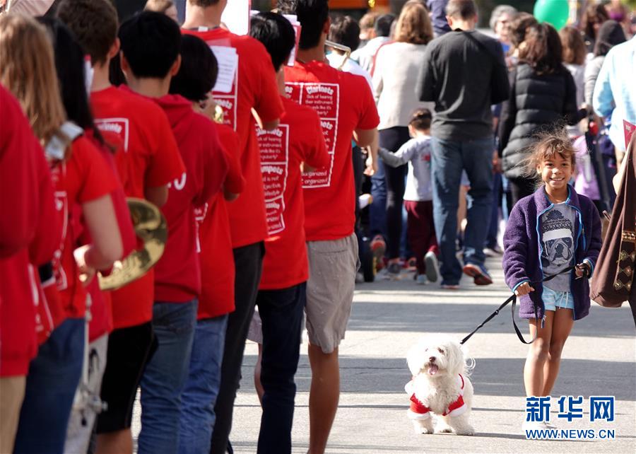 9月29日,在美國加利福尼亞州伯林蓋姆市,一支學(xué)生樂隊(duì)參加寵物狗大游行活動(dòng)。美國加州舊金山灣區(qū)的伯林蓋姆市29日舉行寵物狗大游行活動(dòng)。新華社記者吳曉凌攝