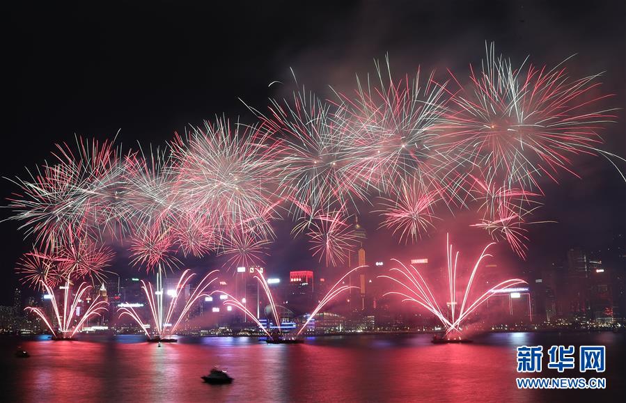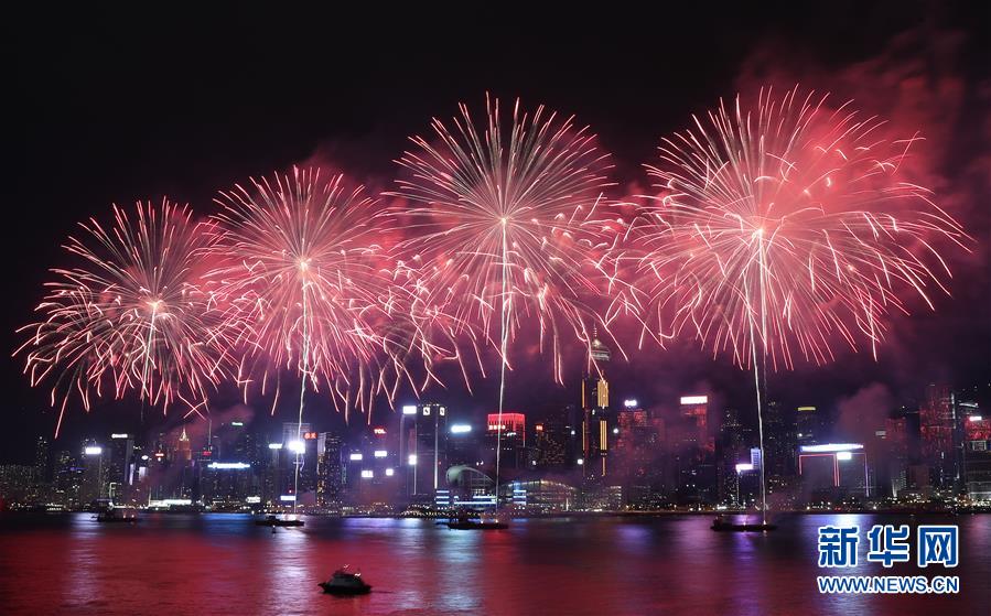這是10月1日晚拍攝的香港維多利亞港煙花匯演。當(dāng)晚,香港維多利亞港舉行煙花匯演,慶祝中華人民共和國成立69周年。新華社記者李鋼攝
