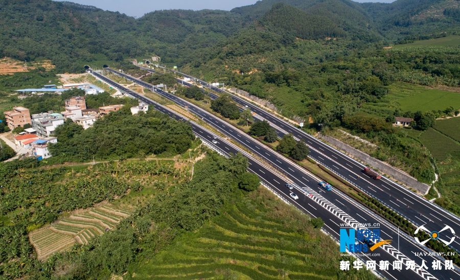 這是改擴(kuò)建工程施工之后的風(fēng)霜嶺隧道外景觀。道路拓寬,坡度平緩(無(wú)人機(jī)拍攝)。新華網(wǎng) 肖和勇 攝