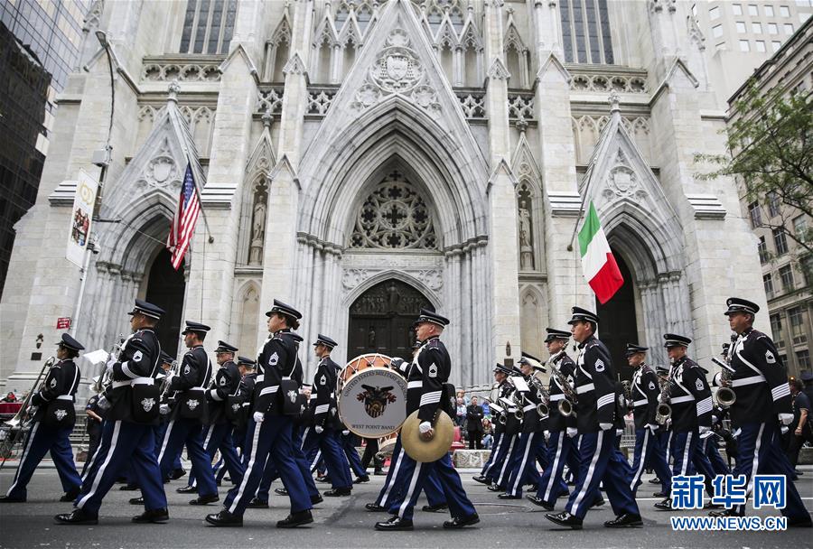 10月8日,在美國紐約曼哈頓第五大道,美國西點軍校樂隊參加哥倫布日游行。 新華社記者王迎攝