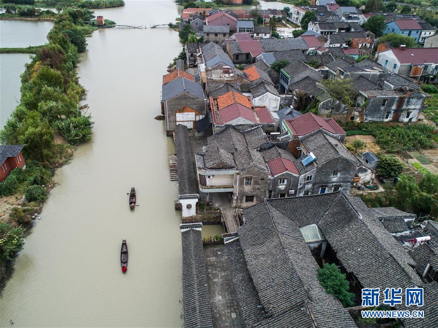 10月10日,泉家潭村村民劃著小船經(jīng)過沿河長廊(無人機拍攝)。經(jīng)過改造提升后,沿河長廊和整潔的古村街巷成為當(dāng)?shù)孛利愢l(xiāng)村的景觀帶。 新華社記者 徐昱 攝