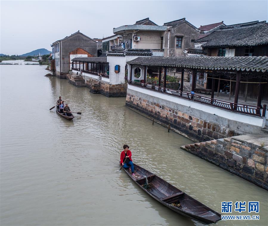 10月10日,泉家潭村村民劃著小船經(jīng)過沿河長廊(無人機拍攝)。經(jīng)過改造提升后,沿河長廊和整潔的古村街巷成為當(dāng)?shù)孛利愢l(xiāng)村的景觀帶。 新華社記者 徐昱