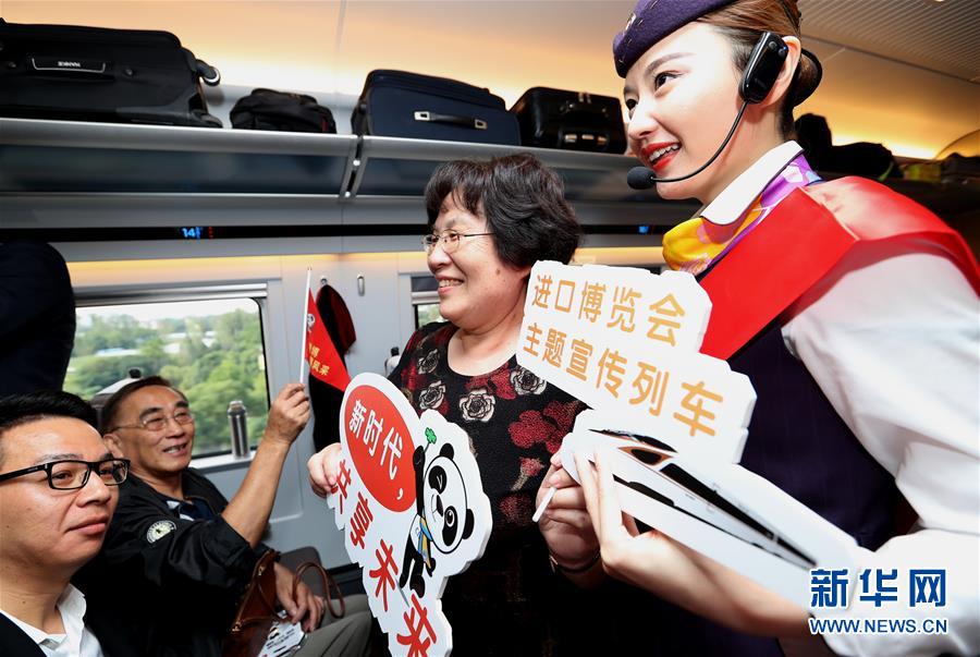 10月10日,G2次列車乘務員向旅客講解首屆中國國際進口博覽會相關信息。 新華社記者陳飛攝