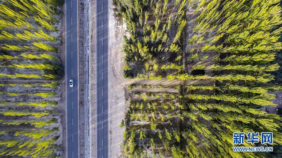 車(chē)輛行駛在新疆阿克蘇地區(qū)柯柯牙綠化工程核心區(qū)(9月20日無(wú)人機(jī)拍攝)。 在世界第二大流動(dòng)性沙漠——塔克拉瑪干沙漠西北邊,一條逾百萬(wàn)畝的人工林帶傲然挺立。 這條林帶就是柯柯牙荒漠綠化工程。它是新疆阿克蘇黃沙漫漫和碧波萬(wàn)頃的分界嶺。 1986年,為改變惡劣的自然條件,阿克蘇啟動(dòng)柯柯牙綠化工程。30年間,各族干部群眾攜手奮斗,曾是沙塵暴策源地的柯柯牙綠樹(shù)成蔭;并以此為原點(diǎn),在南疆戈壁荒灘上孕育出百萬(wàn)畝的“綠?!薄?30多年來(lái),阿克蘇打造出“人走政不息”的樣本,使綠色發(fā)展理念成為幾代人的廣泛共識(shí);“自力更生、艱苦奮斗、無(wú)私奉獻(xiàn)”的柯柯牙精神,已融入各族兒女血液中;“以林養(yǎng)林”“邊綠化邊脫貧”的綠化、脫貧方式,給其他荒漠地區(qū)貢獻(xiàn)了“柯柯牙智慧”。 新華社記者 胡虎虎 攝