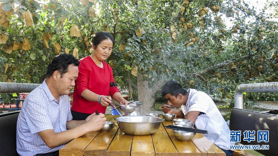 甘永軍(左一)在地處新疆阿克蘇地區(qū)柯柯牙綠化工程內(nèi)的果園吃飯(2017年9月22日攝)。10年前,甘永軍還在果園開起了第一個(gè)農(nóng)家樂,帶動周邊100多戶果農(nóng)經(jīng)營起了自家庭院。 在世界第二大流動性沙漠——塔克拉瑪干沙漠西北邊,一條逾百萬畝的人工林帶傲然挺立。 這條林帶就是柯柯牙荒漠綠化工程。它是新疆阿克蘇黃沙漫漫和碧波萬頃的分界嶺。 1986年,為改變惡劣的自然條件,阿克蘇啟動柯柯牙綠化工程。30年間,各族干部群眾攜手奮斗,曾是沙塵暴策源地的柯柯牙綠樹成蔭;并以此為原點(diǎn),在南疆戈壁荒灘上孕育出百萬畝的“綠?!薄?30多年來,阿克蘇打造出“人走政不息”的樣本,使綠色發(fā)展理念成為幾代人的廣泛共識;“自力更生、艱苦奮斗、無私奉獻(xiàn)”的柯柯牙精神,已融入各族兒女血液中;“以林養(yǎng)林”“邊綠化邊脫貧”的綠化、脫貧方式,給其他荒漠地區(qū)貢獻(xiàn)了“柯柯牙智慧”。 新華社記者 杜剛 攝