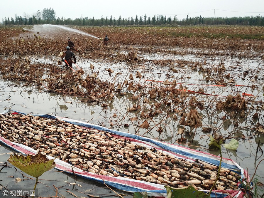 2018年10月14日,江蘇宿遷,泗洪縣曹廟鄉(xiāng)瓦廟村村民在藕蝦共作基地參加挖藕比賽。