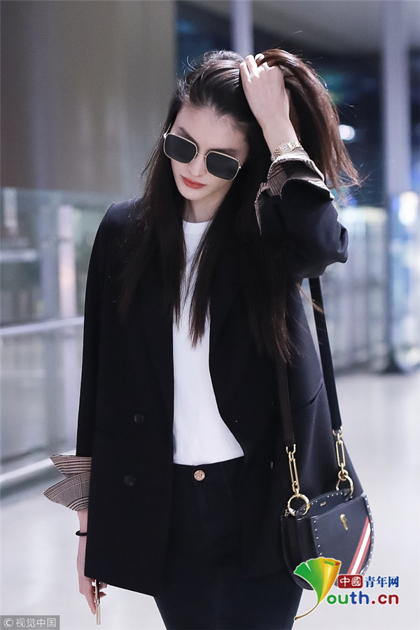 2018年10月15日,上海,何穗亮相機(jī)場(chǎng)。她身穿深色西裝搭配黑色緊身褲大秀超模身材,簡約造型依舊高級(jí)感十足,輕撩秀發(fā)散發(fā)女人味。