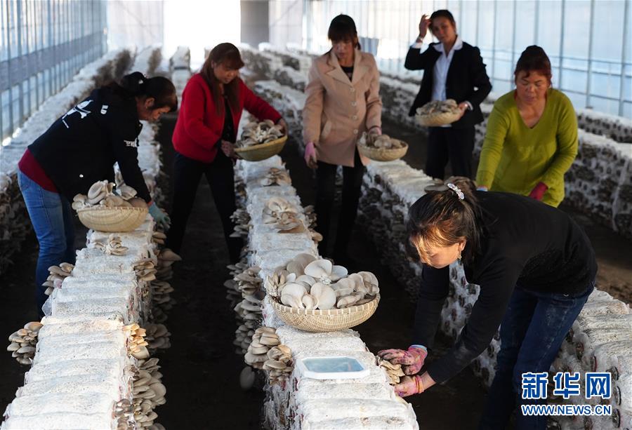 10月15日,黃連河村村民在林下生態(tài)產業(yè)園的大棚內采摘蘑菇。新華社記者邵瑞 攝