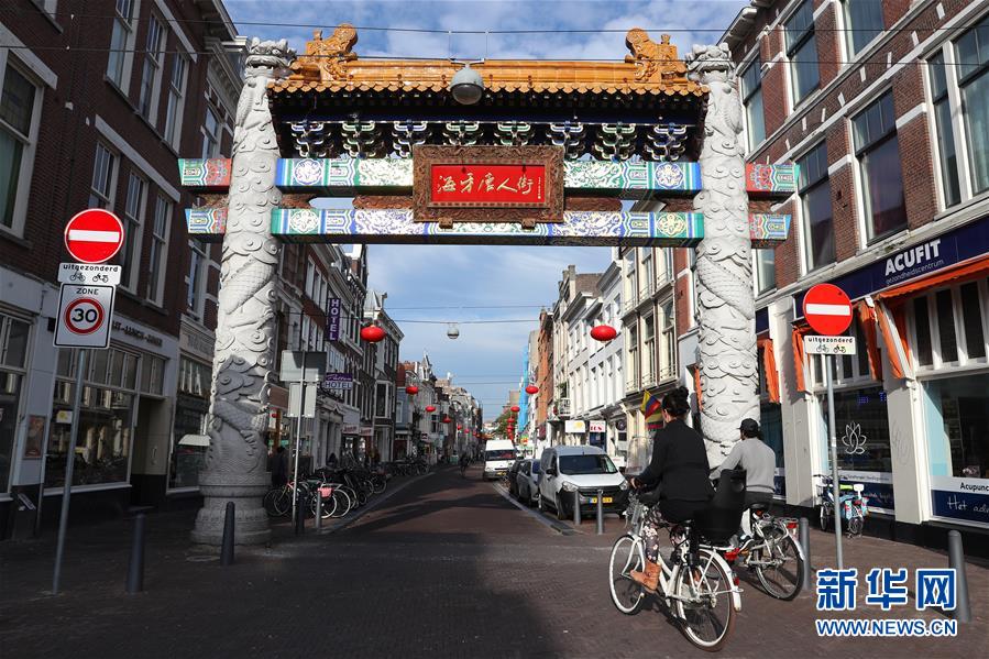 10月15日,在荷蘭海牙,人們騎車(chē)經(jīng)過(guò)唐人街的牌坊。 新華社記者鄭煥松 攝