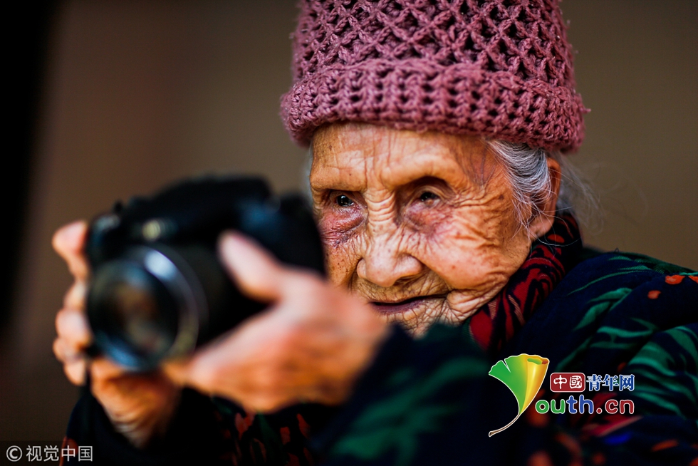 2017年03月02日,廣西壯族自治區(qū)桂林市恭城瑤族自治縣蓮花鎮(zhèn)蓮花街上,有一個(gè)慈眉善目的老人李玉珍,大家都親切地叫她“容伯娘”。她不僅是鎮(zhèn)上碩果僅存的兩位百歲老人之一,還是鎮(zhèn)上那個(gè)最老照相館的攝影師。老人拿起數(shù)碼相機(jī)拍攝照片的眼神依舊犀利。圖片作者:游擁軍/視覺中國