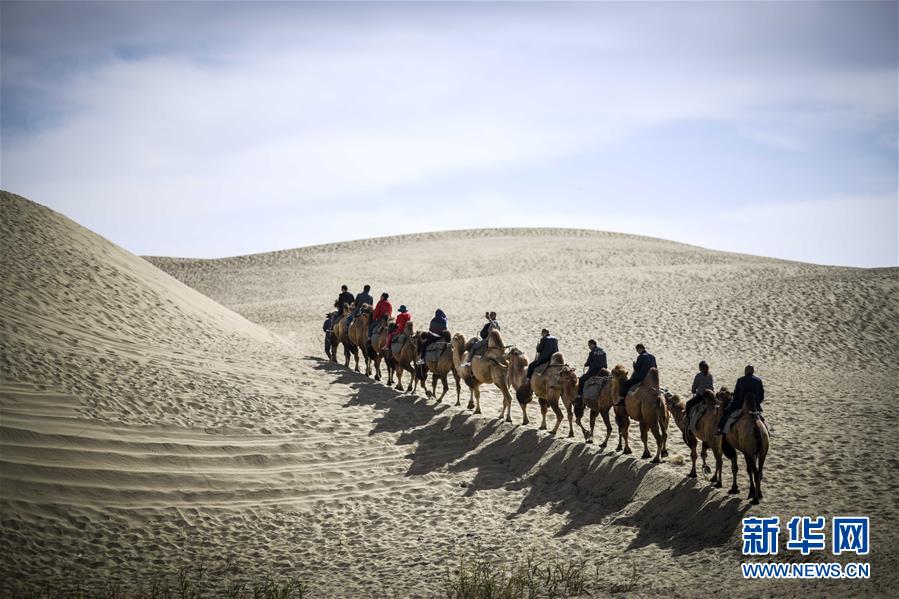 10月16日,游客在羅布人村寨里騎著駱駝?dòng)斡[。 新華社記者 趙戈 攝