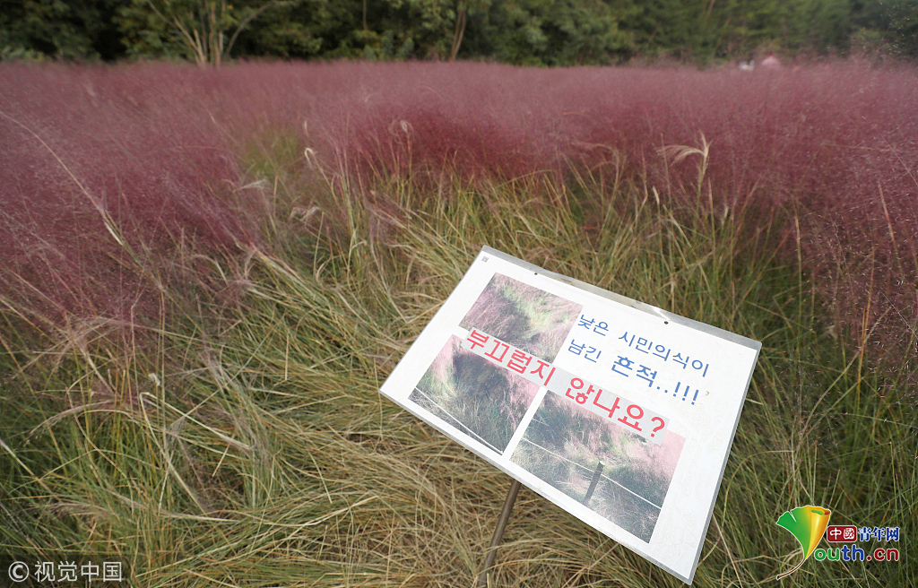 當(dāng)?shù)貢r間2018年10月16日,韓國蔚山,近日,蔚山公園大片粉黛亂子草盛開,粉紅花海浪漫十足,但部分花海遭游客隨意踩踏。公園并沒有修復(fù)遭破壞區(qū)域,而是用繩索圍起并掛上批判性告示,呼吁游客腳下留情。圖片作者:Yonhap News Agency