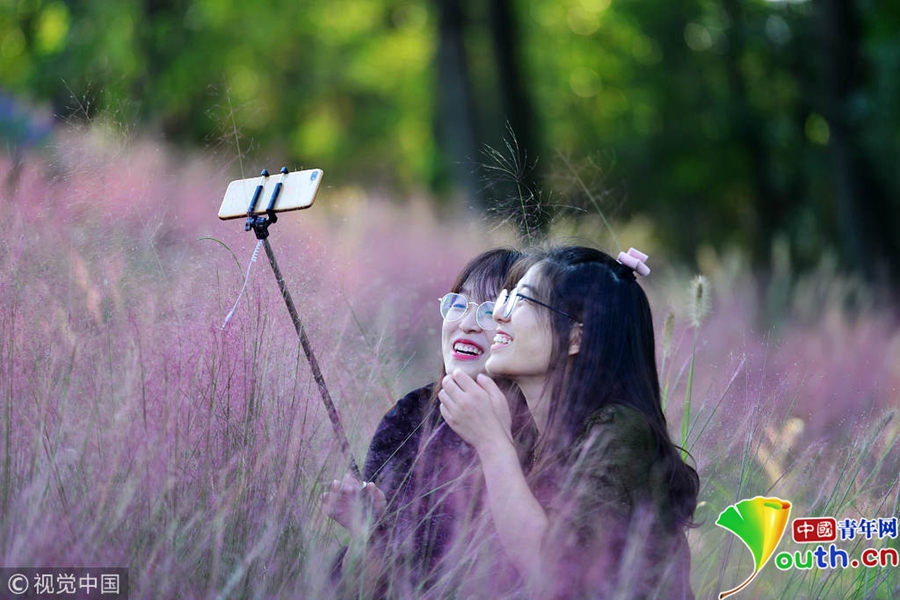 美女游客在江心洲粉黛亂子花田賞花拍照。