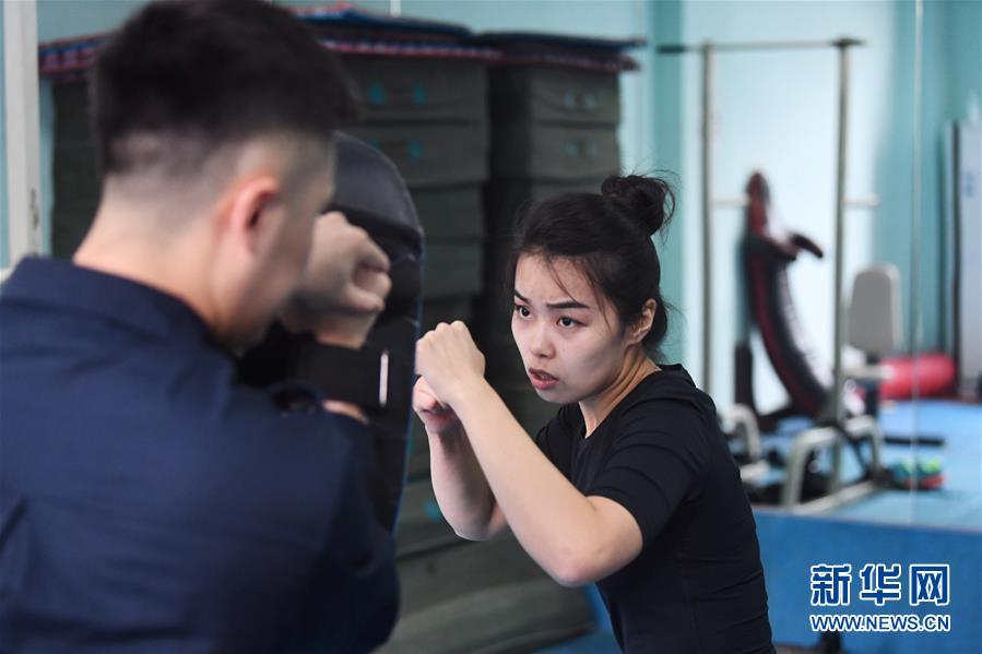10月16日,湯春燕在健身房內(nèi)進(jìn)行擒敵訓(xùn)練。