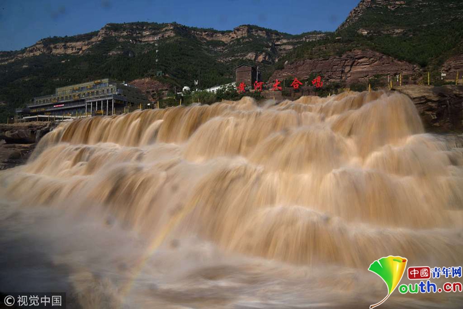 5月31日,山西臨汾奔騰咆哮的黃河壺口瀑布吸引游客。近日,受上游地區(qū)降雨量增多影響,黃河干流晉陜峽谷水量大增,每秒流量達(dá)到1100立方,是常年同期的三倍,壺口瀑布出現(xiàn)五月份罕見的瀑布群景觀,吸引了眾多游客。圖片來源:視覺中國