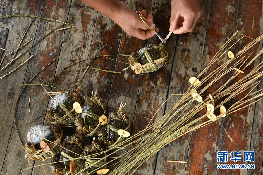 10月17日,湖州廟港人水產(chǎn)有限公司蟹農(nóng)在太湖養(yǎng)殖基地包裝大閘蟹。 時(shí)值重陽,太湖南岸的大閘蟹開始大批量上市,迎來豐收季。浙江省湖州市近年來結(jié)合太湖水治理,提升太湖漁業(yè)資源質(zhì)量。目前,湖州太湖蟹養(yǎng)殖面積3.6萬畝左右,年產(chǎn)3000多噸。 新華社記者翁忻旸攝