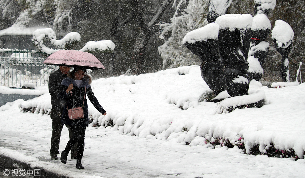 10月18日,行人穿行在烏魯木齊積雪覆蓋的人行道上。當日,新疆烏魯木齊迎來一場降雪。 新華社記者 江文耀 攝