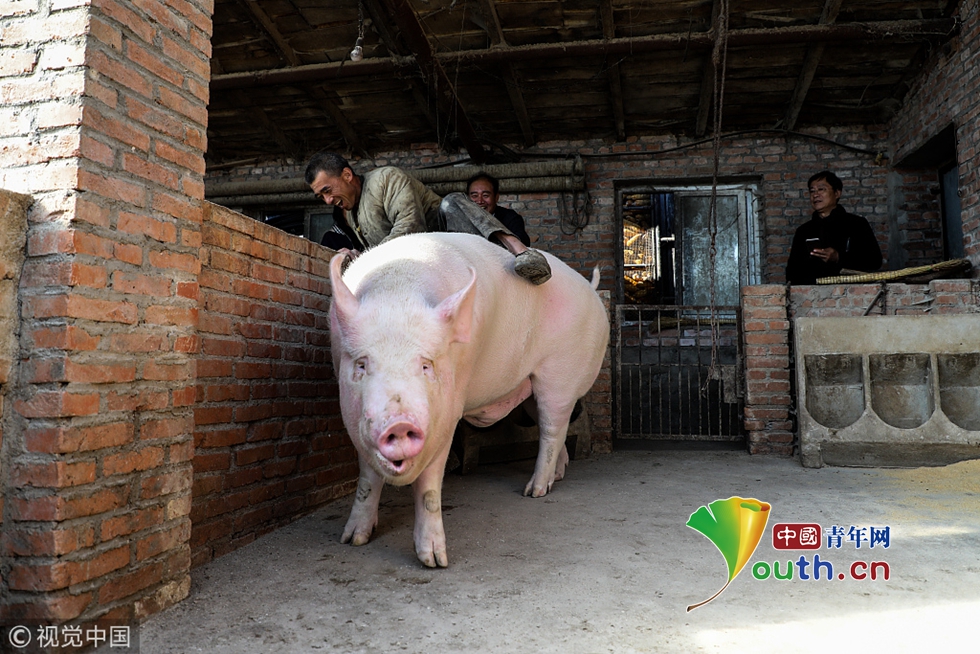 村里一位83歲的老人在圍觀時(shí)說(shuō),活了一輩子第一次見(jiàn)到這么大的豬,豬是好豬,但是賣(mài)不出去愁人啊。900斤大豬是個(gè)什么概念?體長(zhǎng)2米25、腰圍1米75,站立高度1米10。此時(shí)此刻,900斤大豬完全不知主人的苦,也完全不知道外面的世界發(fā)生了什么。圖為養(yǎng)豬戶張先生險(xiǎn)些從900斤大豬背上摔下來(lái)。圖片作者:棋簿紫/視覺(jué)中國(guó)