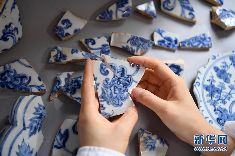 10月18日,在江西景德鎮(zhèn),工作人員修復(fù)明代古瓷片。 新華社記者 萬象 攝