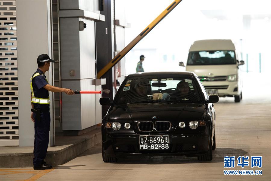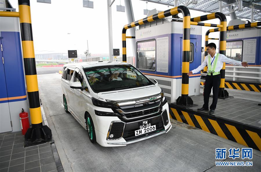 10月24日,首輛私家車在澳門口岸離境車道上通關(guān)。當日9時,港珠澳大橋正式通車。 新華社記者張金加攝