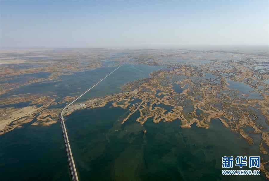218國(guó)道在塔里木河尾閭——臺(tái)特瑪湖中間延伸(2017年10月22日無人機(jī)拍攝)。 新華社記者 趙戈 攝