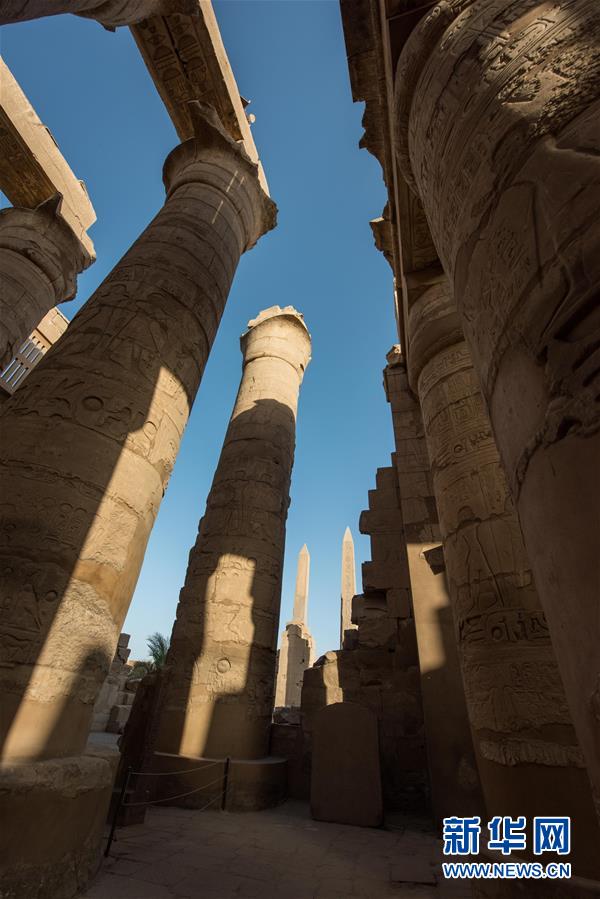 這是10月23日在埃及盧克索拍攝的卡納克神廟內(nèi)的石柱與方尖碑。