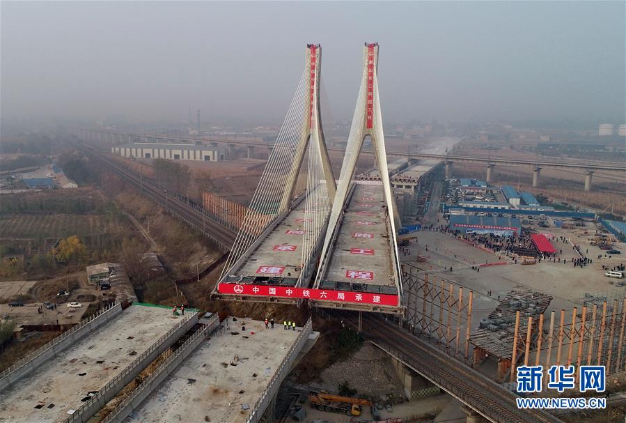 10月25日,唐山市二環(huán)路項目上跨津山鐵路斜拉橋在轉體中(無人機拍攝)。 當日,河北省唐山市二環(huán)路項目上跨津山鐵路斜拉橋轉體成功。據(jù)介紹,該橋總長927.5米,主橋由斜拉轉體橋和轉體T構橋組成,轉體總重5.1萬噸,其中斜拉轉體橋重3.3萬噸,主塔高達80.5米,為曲線變截面“雙人字”形空心塔,自上而下共有128根斜拉索。 新華社記者楊世堯攝