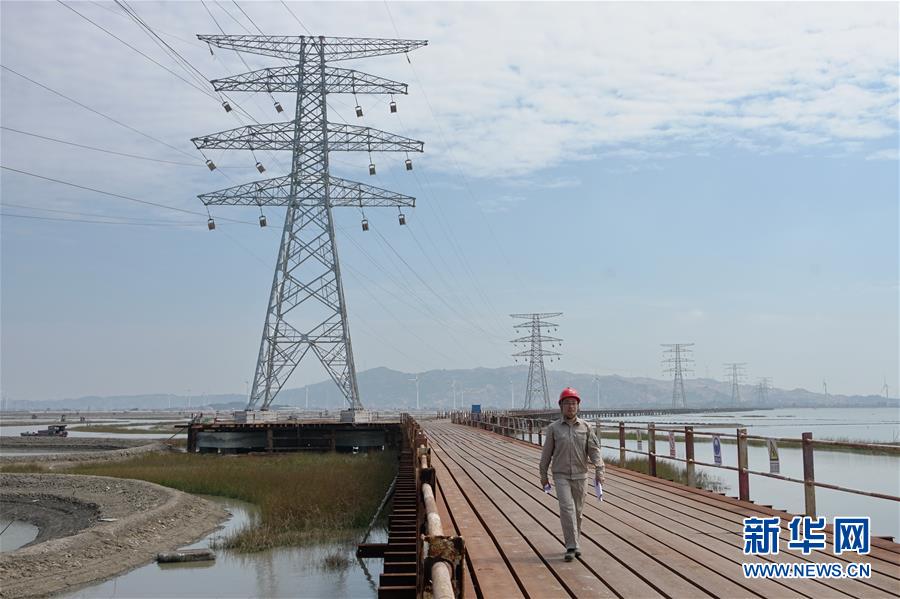 10月25日,施工人員從莆田埭頭風(fēng)電220千伏送出工程橫跨平海灣的全路徑棧橋上通過(guò)。 新華社記者林善傳攝