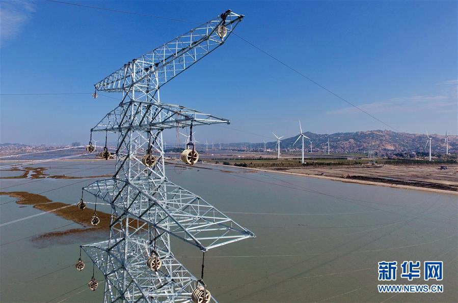 這是建在莆田平海灣上開(kāi)始架線的輸送風(fēng)電鐵塔和遠(yuǎn)處的東嶠風(fēng)力發(fā)電場(chǎng)(10月25日無(wú)人機(jī)拍攝)。 新華社記者林善傳攝