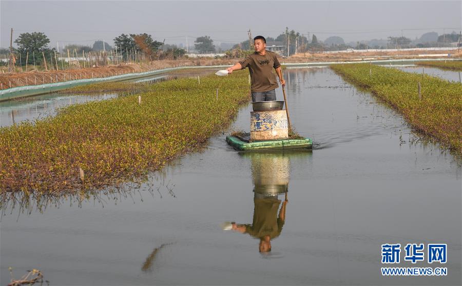 “70后”村民李錦和在自家蟹塘里給螃蟹苗喂食(10月24日攝)。李錦和在開弦弓村經(jīng)營著近50畝蟹塘,專養(yǎng)螃蟹苗,每天從早上5點就開始忙碌,到了10月份蟹苗上市的季節(jié)就更加忙碌了,幾乎日夜守護在蟹塘邊。開弦弓村90%的水域用于水產(chǎn)養(yǎng)殖,以蝦蟹為主。 新華社記者 季春鵬攝